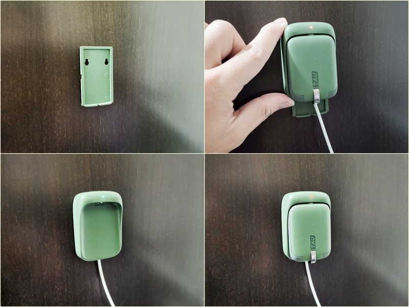充電座的安裝也相當簡單,只要將壁掛面板先透過無痕膠黏住,或是固定螺絲固定,再將充電座滑入安裝即可,接上電源待機時就會亮起綠色指示燈,充電狀態則會顯示紅色