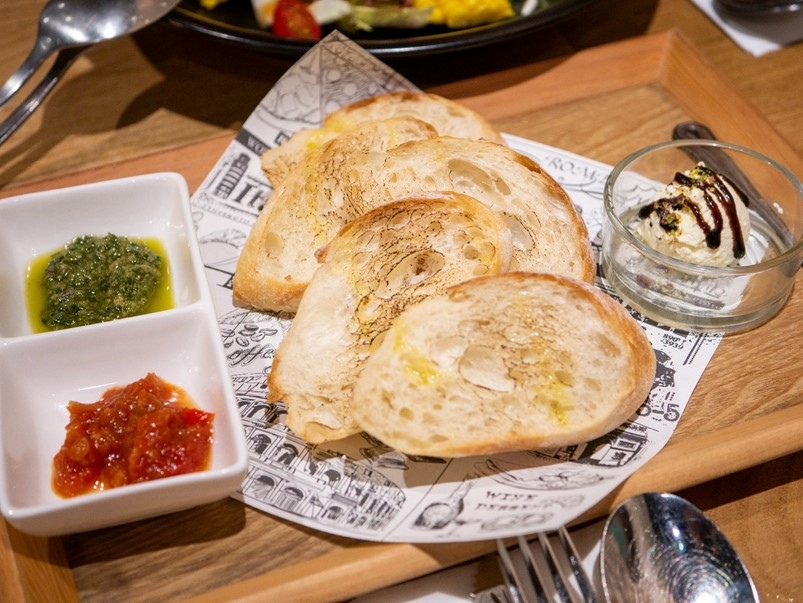 這次選擇了套餐再加上另外單點,首先來的是長棍切片與義大利風味三色醬,起司奶香濃郁,搭配黑色的巴薩米可醋膏調味更清爽,青醬帶有新鮮羅勒的香味,很有義大利的風味,番茄醬鹹香帶點番茄酸味清香,脆脆的口感再加上不同的醬有不同的風味,很開胃