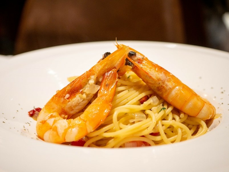 經典辣味鮮蝦義大利麵,微辣辛口帶有點蒜香,好吃不膩,是比較保守口味的義大利麵